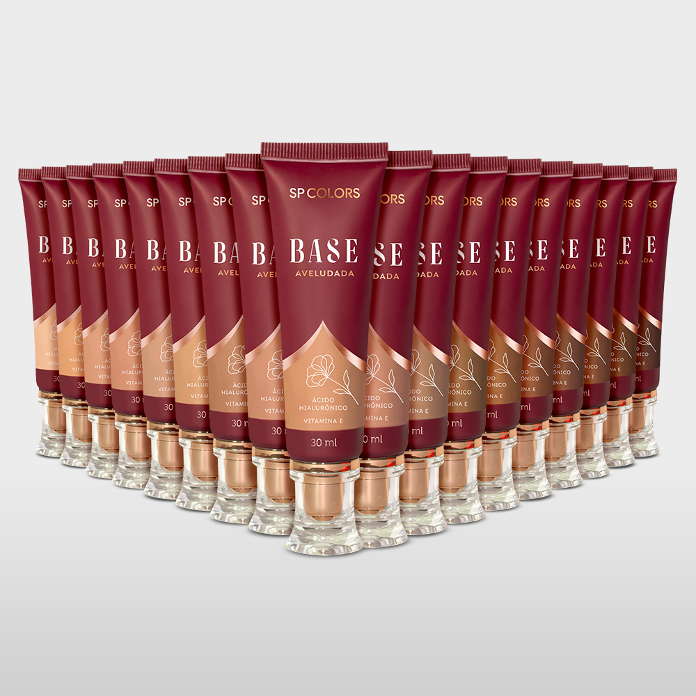 Trazendo 18 tonalidades, com ativos, benefícios e um acabamento incrível na pele, chegou a Base Aveludada da SP Colors! Há mais de um ano sendo desenvolvida, a base contém vitamina E, que é rica em ação antioxidante e ácido hialurônico, que hidrata e mantém essa hidratação na pele durante seu uso! Ela possui uma textura incrível, que desliza na pele de maneira uniforme, com ótima espalhabilidade e rendimento, deixando uma sensação extremamente confortável ao usá-la! Sua cobertura é considerada de leve a média, sendo possível construir camadas para uma maior cobertura, sem marcar poros ou linhas de expressão. A base traz um efeito aveludado sutil com glow suave, que resulta em um acabamento lindíssimo e muito natural. Além disso, ela não oxida após a aplicação e é resistente à água, ou seja, ela não vai te deixar na mão por ai! Sabemos que a embalagem no formato de bisnaga é a mais queridinha, por isso, a Base Aveludada possui essa embalagem, por ser prática, leve e que permite que o produto seja usado até o final! Possui um dosador bem fininho, para que sua aplicação seja feita de forma controlada e tenha fácil alcance em áreas menores do rosto! Também trouxe um design clean e sofisticado, com detalhes em hot stamping que afirmam ainda mais o empoderamento e beleza que ela vai te proporcionar!